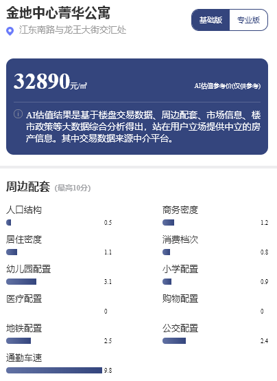 以距离嘉华嘉璟峰仅533米的金地中心菁华公寓项目为例,该项目与嘉璟峰共享着地铁、商业和医疗等基础配套。每经品房小程序显示,金地中心菁华公寓的估值参考价约为3.29万元/平方米,在包括人口结构、居住密度、商务密度等在内10项指标中,通勤车速得分为9.8分,而其他指标得分均低于4分,这在一定程度上反映了该项目周边人流相对较为稀少,整体居住配套仍处于待完善状态。