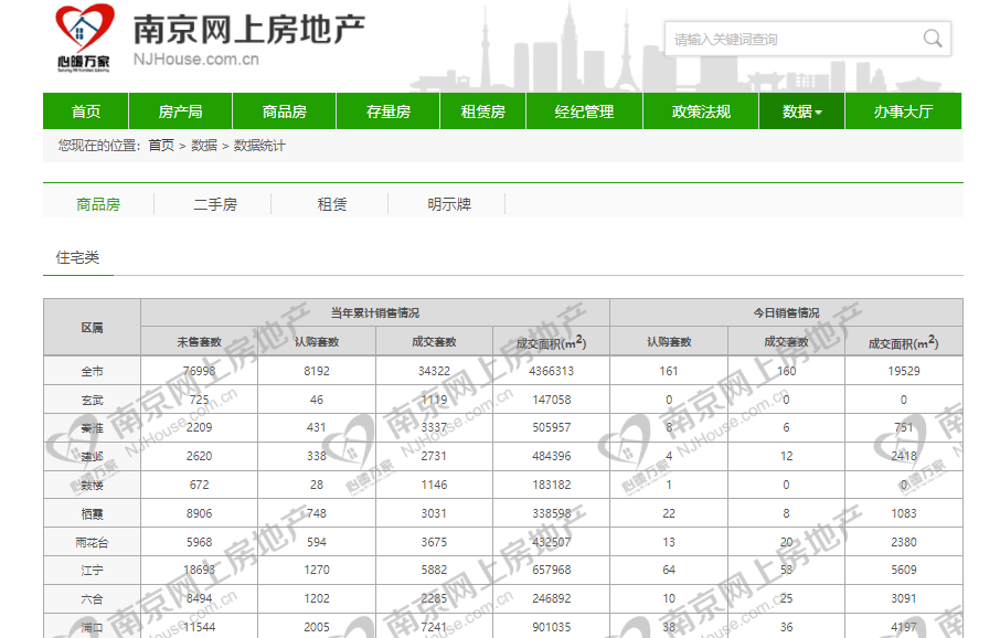 截至6月14日,南京市未售新房房源量约7.7万套,主城区、郊区板块冷热不均。图/南京网上房地产官网截图