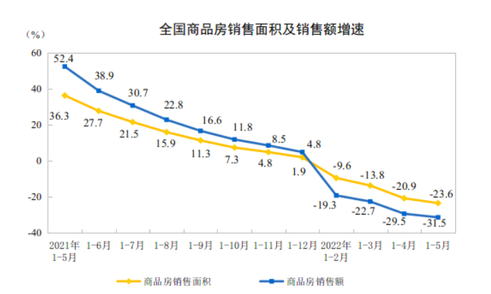国家统计局数据显示,今年1-5月份,商品房销售面积约5.07亿平方米,同比下降23.6%,其中住宅销售面积下降28.1%;商品房销售额48337亿元,同比下降31.5%,其中住宅销售额下降34.5%。截至5月末,商品房待售面积5.54亿平方米,同比增长8.6%,其中住宅待售面积增长15.0%。